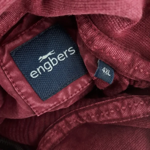 Originalni muški dukser Engbers u odličnom stanju (pogledajte slike). Visoka kragna sa kopčanjem na četiri dugmeta. Bogata bordo (burgundy) boja sa „washed“ efektom koji naglašava teksturu materijala. Ceo materijal je rebrast, što daje puninu i „heavyweight“ osećaj. Puniji, kvalitetni pamuk, veoma mekan i prijatan za nošenje, a opet dovoljno topao za hladnije dane.
