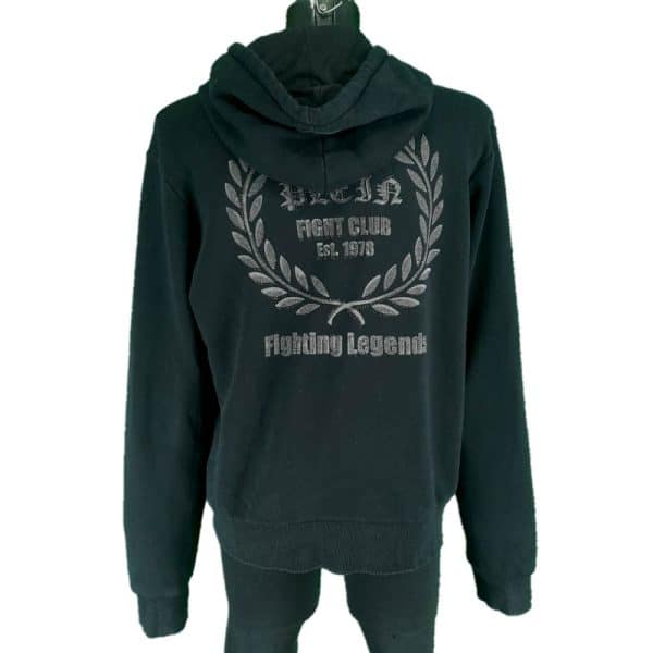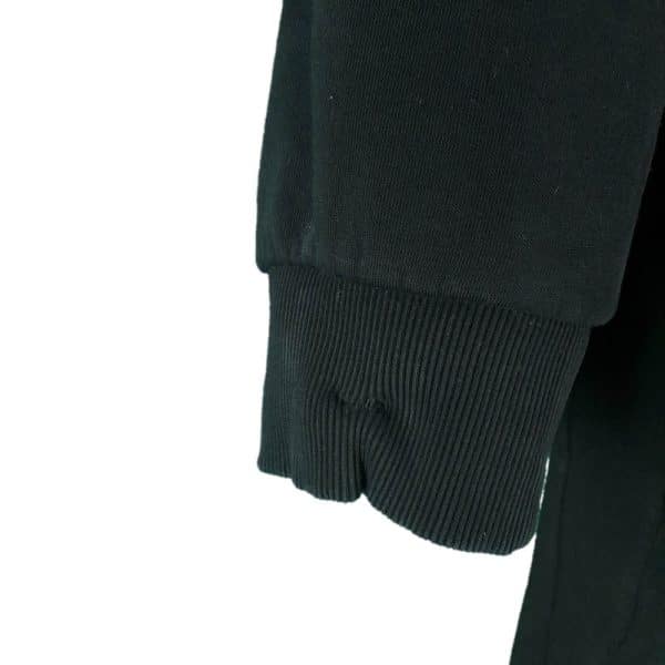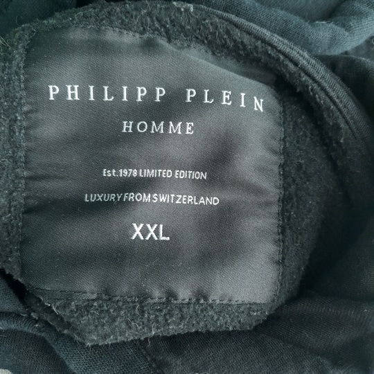 Originalni muški dukser Philipp Plein u dobrom stanju (pogledajte slike). Crne boje, kapuljača, velika aplikacija na prednjoj strani, ranfle na dnu i rukavima, pamučan. Tragovi nošenja u vidu ušivene desne ranfle i blago izbledelog poruba ranfle – pogledati slike.