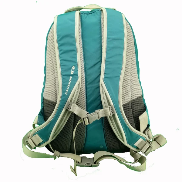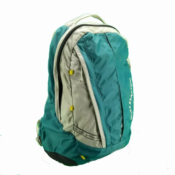 Originalni ranac Salomon u odličnom stanju (pogledajte slike). Kombinacija tirkizno-plave (petrol) i svetlosive boje sa žutim detaljima na kopčama i rajsferšlusima, kapaciteta od 25 litara. Zadnji panel je postavljen mrežastim materijalom koji omogućava bolju ventilaciju i sprečava prekomerno znojenje leđa. Ranac poseduje grudni kaiš koji je podesiv po visini, sa kopčom za fiksiranje naramenica, kao i pojasni kaiš oko struka koji sprečava „šetanja“ ranca tokom trčanja ili bržeg hoda. Sportski model, idealan za jednodnevne planinarske ture, biciklizam ili aktivnu svakodnevnu upotrebu.