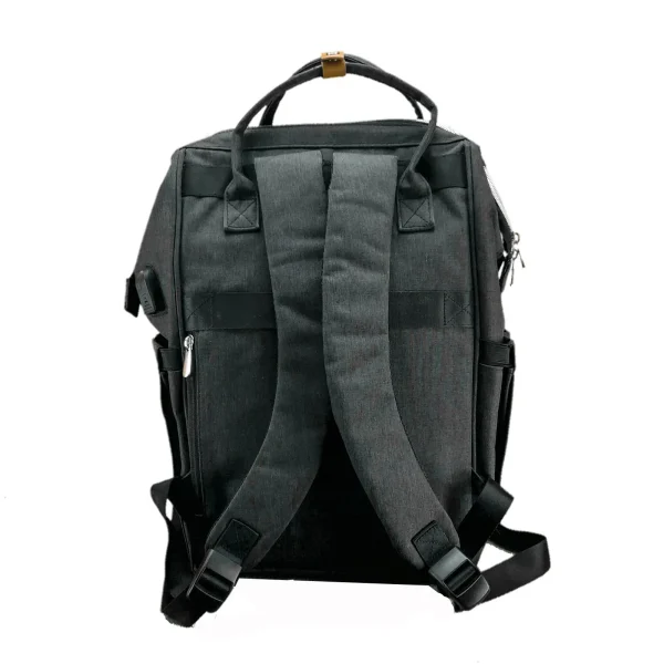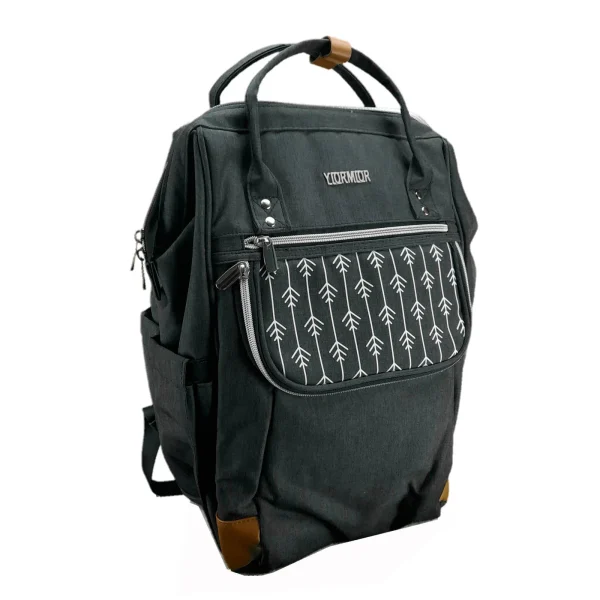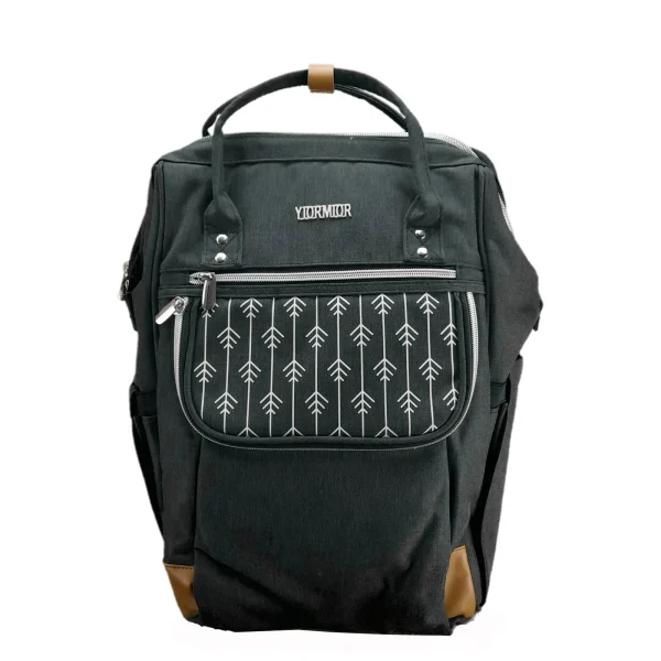 Originalni ranac Yiormior u odličnom stanju, kao nov (pogledajte slike). Glavna boja je tamnosiva (antracit) sa efektom teksture platna. Prednji džep krasi moderan geometrijski print sa belim strelicama. Sa bočne strane (vidljivo na slici poleđine) nalazi se ugrađeni USB priključak, što omogućava punjenje telefona u hodu. Na poleđini se nalazi vertikalni rajsferšlus („anti-theft“ džep) koji služi za čuvanje dragocenosti (novčanik, pasoš) dok je ranac na leđima. Horizontalna traka na zadnjoj strani omogućava da se ranac lako natakne na ručku kofera. Izuzetno funkcionalan model, poznat po svom „doktorskom“ otvaranju (široki metalni okvir na vrhu) i dizajnu koji je podjednako popularan kao torba za mame, ali i kao praktičan ranac za laptop i putovanja. Preporuka!
