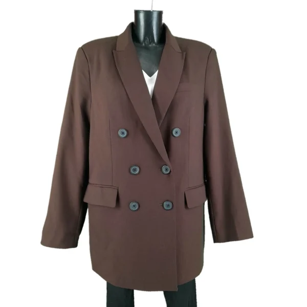 Originalni ženski sako Stradivarius u odličnom stanju, kao nov (pogledajte slike). Tamno braon boja, postavljen, sa naramenicama. Oversized model. Preporuka!